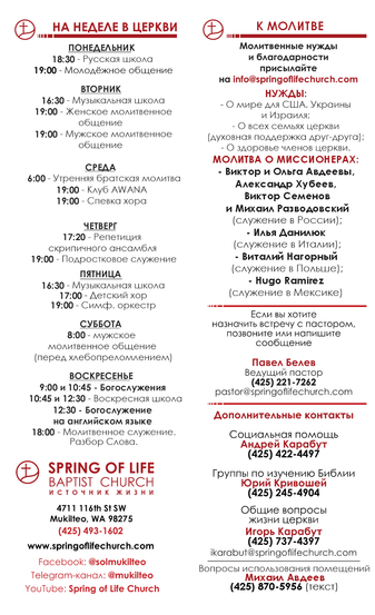 Еженедельный церковный бюллетень - это информация о жизни церкви, а также дни рождения членов церкви на ближайшую неделю.